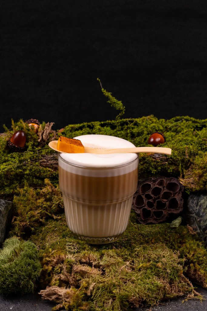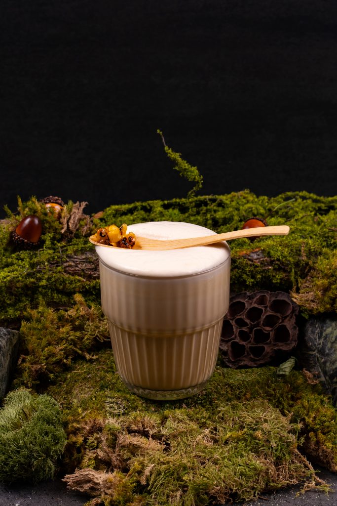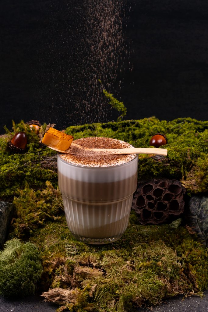 piure de bostan cu condimente, lapte fără lactoză, sirop de mirodenii, cocos