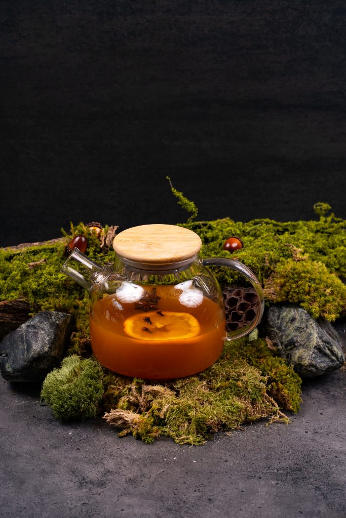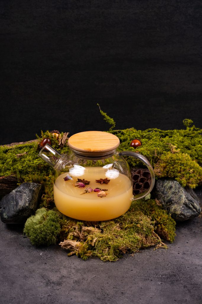 Infuzie de rooibush, piure de bostan, sirop de macadamia, suc de ghimbir